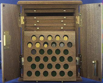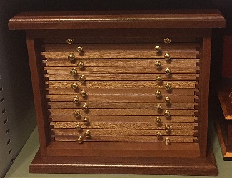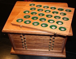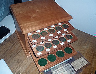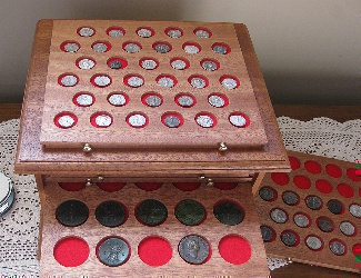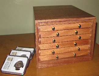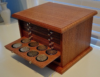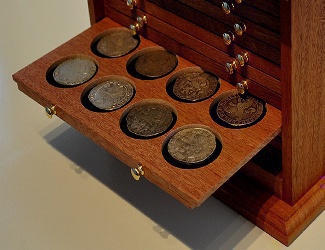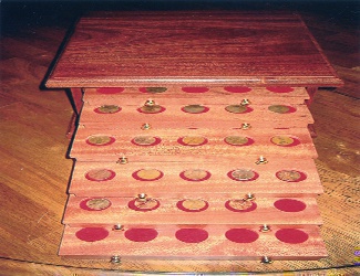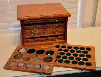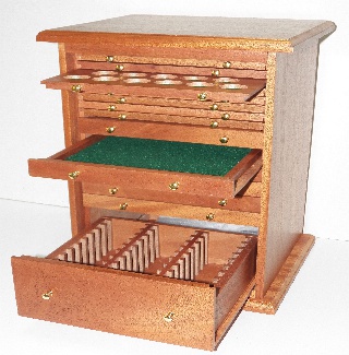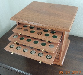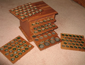 house his collection of tetradrachms. The actual size of the completed cabinet is 8-1/2" W x 9-3/4" D x 5" H. Each tray is 5/8"