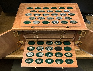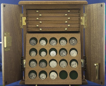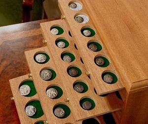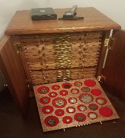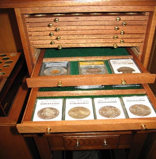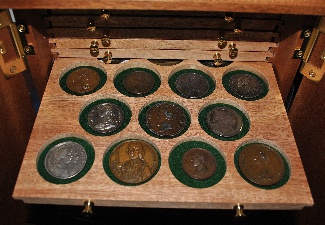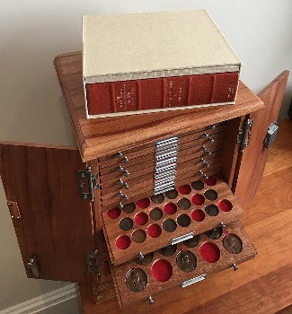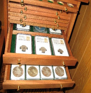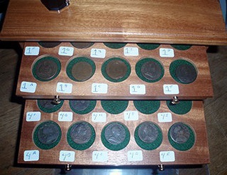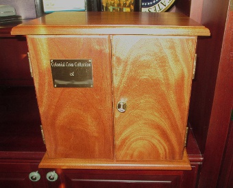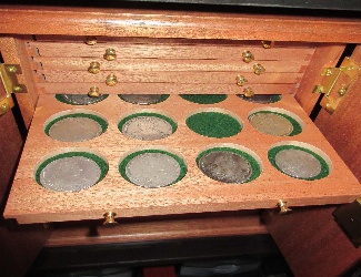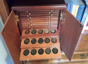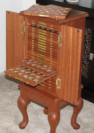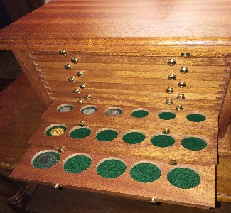 The cabinet above was ordered by a gentleman to display his collection of Colonial and early US coins. He shared with me an inventory of