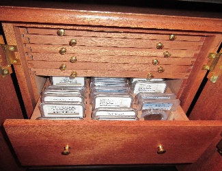Here is a cabinet containing both the traditional style trays as well as several "open format" trays to hold slabs or other larger