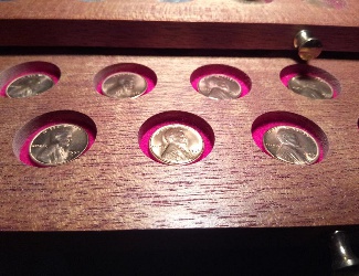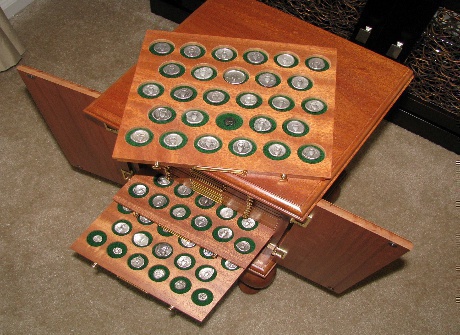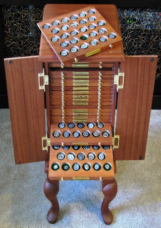 This was a custom cabinet for a gentleman who wanted both standard round coin spaces, "open format" trays to display items in a