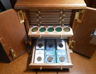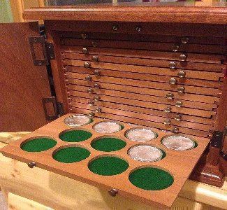 trays designed to hold slabbed coins, and locking doors. I especially love the grain pattern in the panels I used for the doors. He requested
